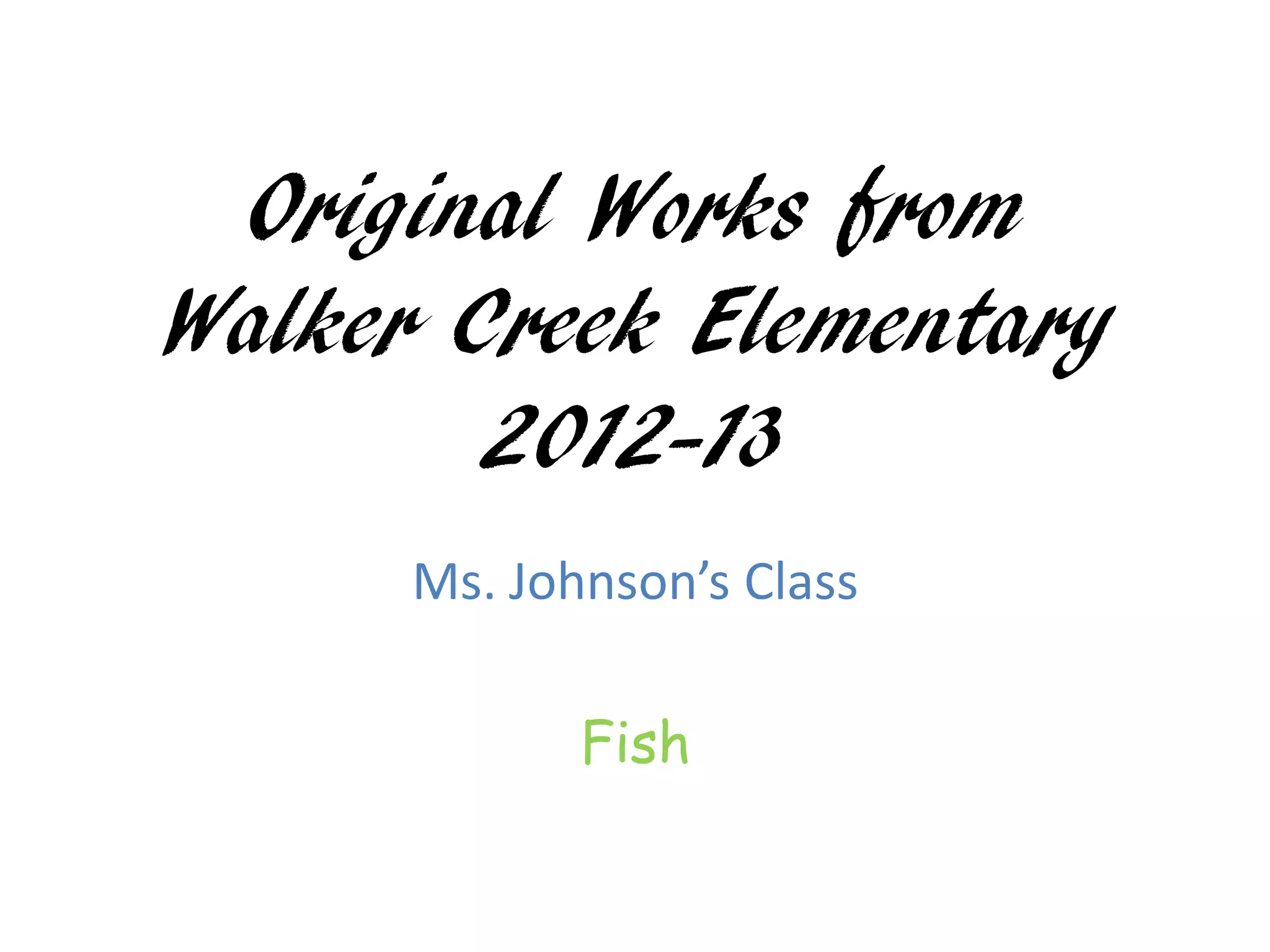 The document appears to be a title page for original works created by students in Ms. Johnson's class at Walker Creek Elementary school during the 2012-13 school year. It lists "Fish" as the only work.