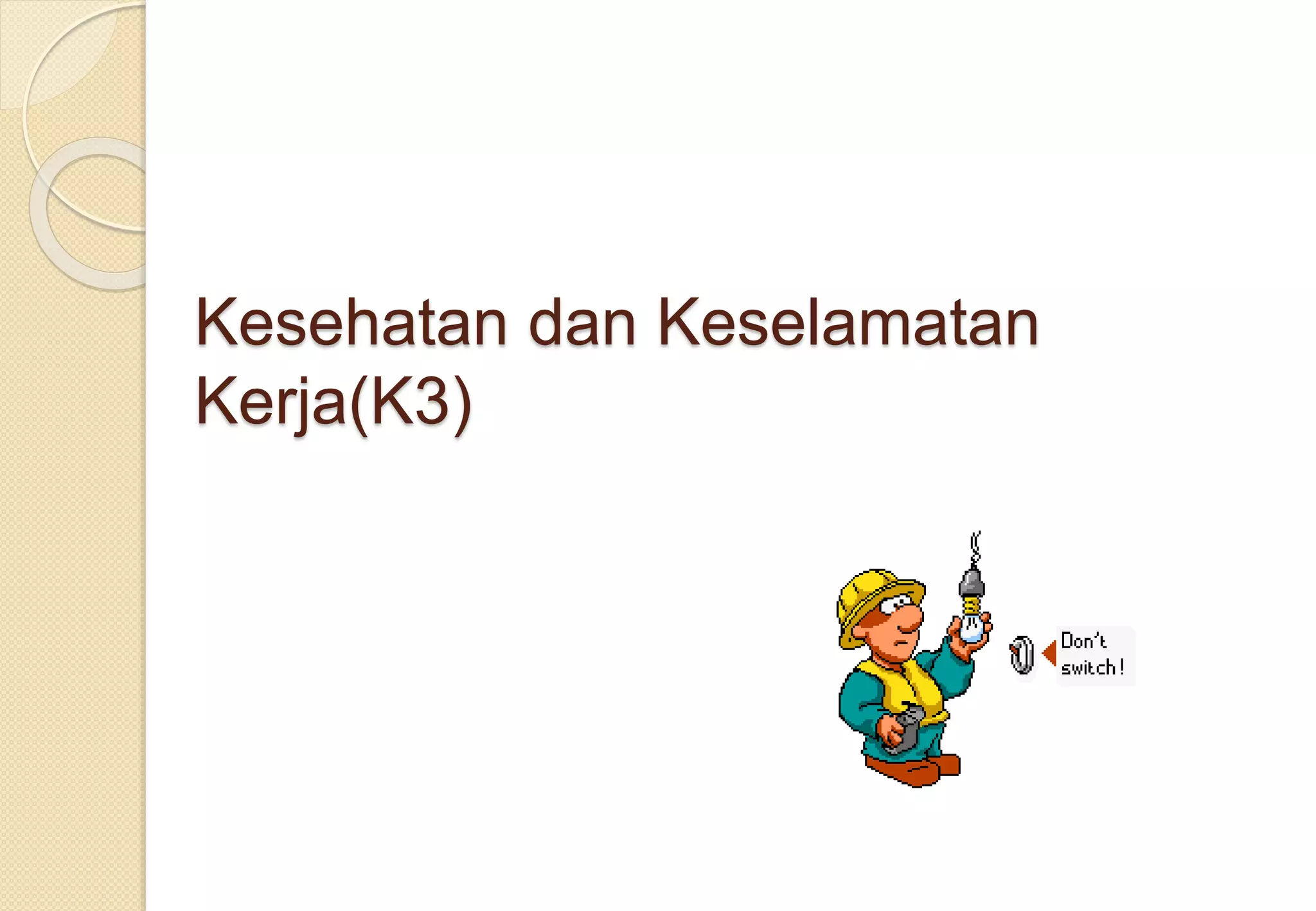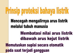 Dokumen ini membahas kesehatan dan keselamatan kerja (K3) terkait dengan instalasi listrik, meliputi bahaya terkait listrik, risiko sengatan, serta cara perlindungan dan pencegahan kecelakaan. Informasi penting termasuk metode proteksi dari kejut listrik dan sambaran petir, serta langkah-langkah preventif yang harus diambil untuk memastikan keselamatan pekerja. Penekanan juga diberikan pada tanggung jawab manajer dan pekerja dalam menjaga keselamatan di tempat kerja.
