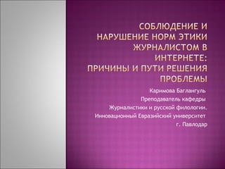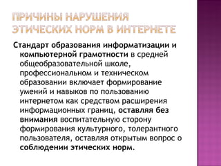 Документ обсуждает важность формирования умений и навыков пользования интернетом, акцентируя внимание на правовых и этических нормах общения в сети. Преподаватели должны развивать у учащихся социальную адаптацию, уважение к культуре общения и навыки работы в группе. Также рассматриваются основные правила журналистики и этикета в интернете, включая понятия авторского права и риск спама.