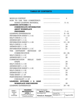 This document is a training module on leading workplace communication. It contains learning materials for trainees/students, including information sheets, self-checks, and task sheets related to three learning outcomes: (1) communicating information about workplace processes, (2) leading workplace discussions, and (3) identifying and communicating issues arising in the workplace. The module provides guidance to trainees/students on how to use the materials to develop their competency in leading workplace communication.