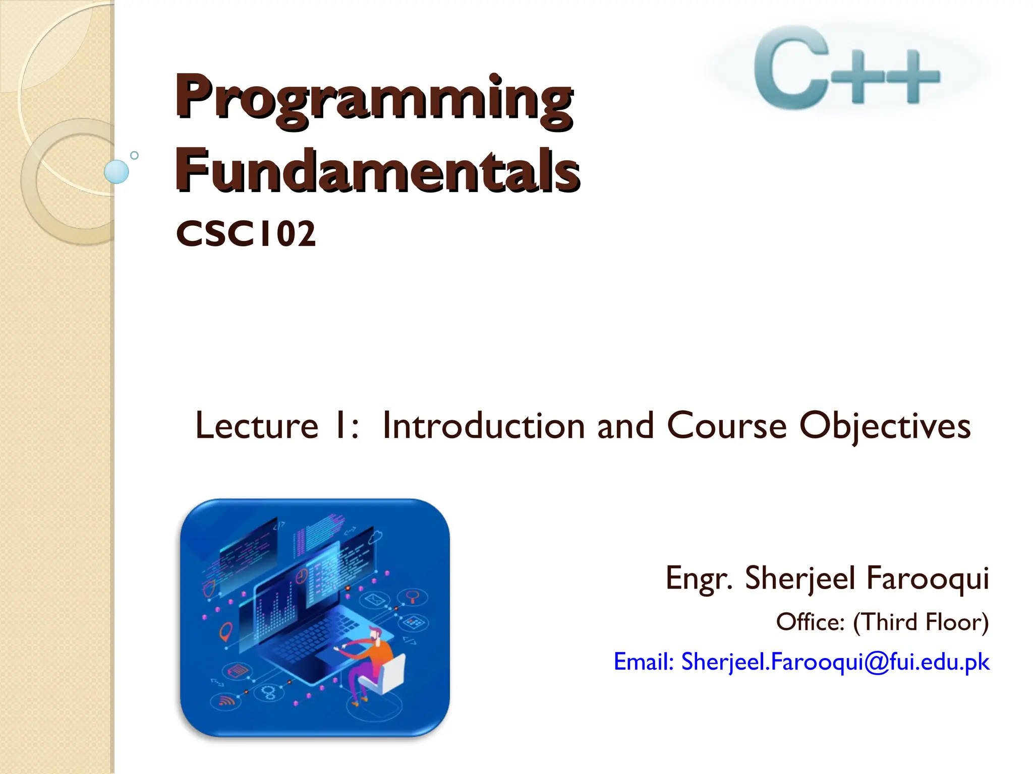 The document outlines the course 'Programming Fundamentals' (CSC102) taught by Engr. Sherjeel Farooqui, covering basic concepts of programming using C/C++. It includes course objectives, materials, grading criteria, attendance requirements, and a detailed week-by-week course outline. By the end of the course, students will be capable of designing modular programs, utilizing arrays, and implementing basic algorithms.