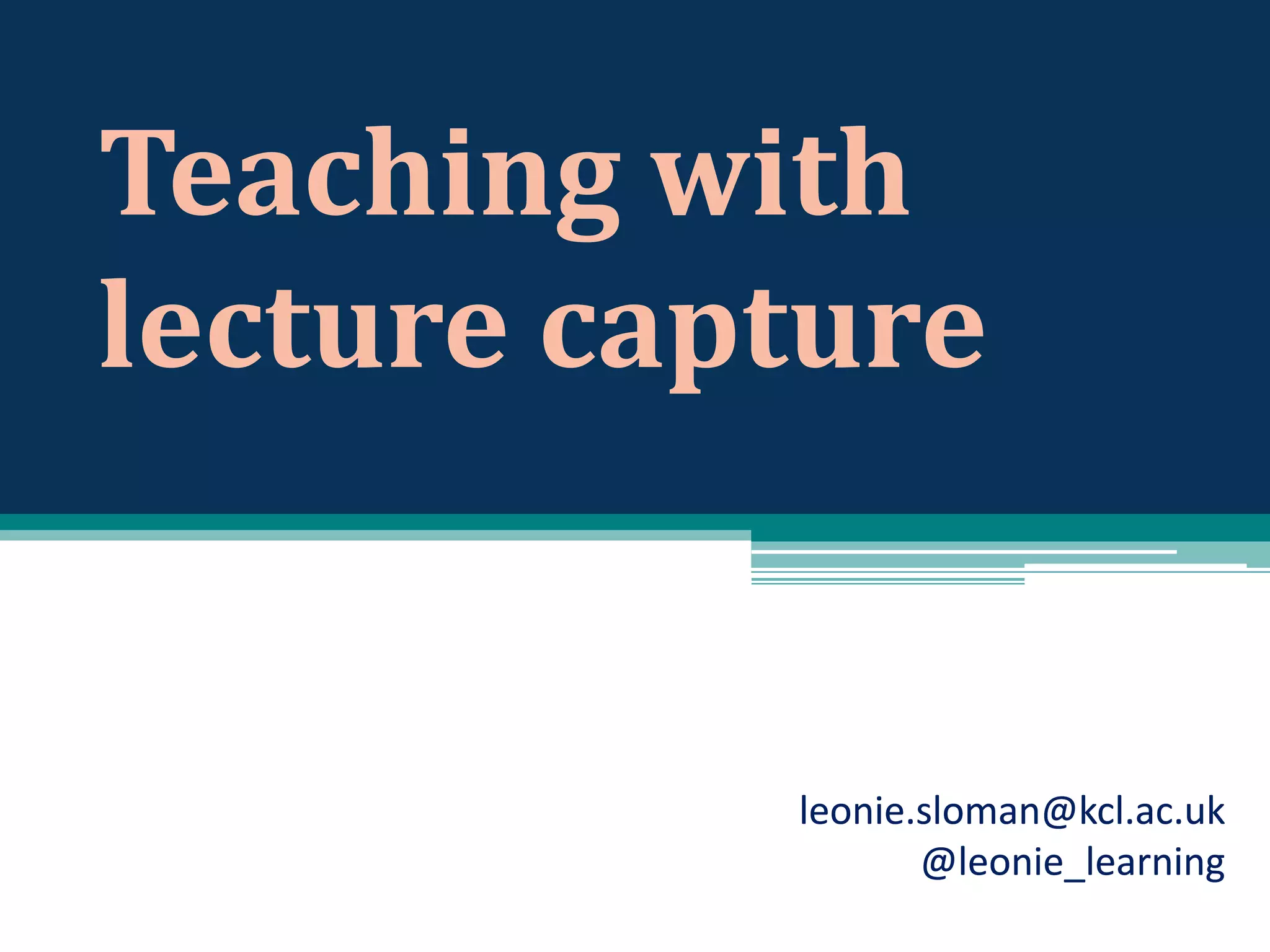This document outlines a research project on lecture capture at King's College London, focusing on its impact on year 1 and 2 medical and biomedical science students and faculty attitudes. It highlights varying levels of lecturer enthusiasm, concerns about system reliability, pressure to record, and implications for teaching practices. The findings indicate that while some lecturers see value in the technology, issues such as copyright, recording permanence, and student pressure significantly affect their perspectives.