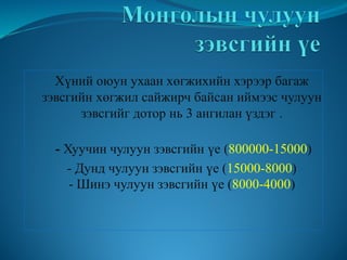 Хүний оюун ухаан хөгжихийн хэрээр багаж зэвсгийн хөгжил сайжирч байсан иймээс чулуун зэвсгийг дотор нь 3 ангилан үздэг . - Хуучин чулуун зэвсгийн үе (800000-15000) - Дунд чулуун зэвсгийн үе (15000-8000) - Шинэ чулуун зэвсгийн үе (8000-4000)