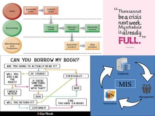 This document discusses Management Information Systems (MIS). It defines MIS as an integrated system that provides information to support operations, management, and decision making in an organization. MIS processes data into information that is communicated to departments for decision making. It discusses the characteristics of MIS including providing standardized reports, using internal data, and requiring formal requests from users. Various types of MIS are also outlined such as transaction processing systems, decision support systems, executive information systems, and more. The advantages of MIS for organizations are also highlighted.