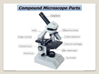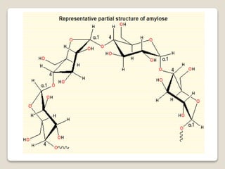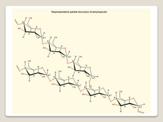 The purpose of a microscope is to magnify small objects that cannot be seen by the naked eye. It has an eyepiece, tube, arm, base, illuminator, condenser, stage, objectives, and coarse and fine adjustments. Total magnification is calculated by multiplying the eyepiece and objective magnifications. Starch is a polysaccharide reserve food material found in plants. It occurs as granules that can be identified by their shape, size, hilum, striations, aggregation, and solubility and color reactions. Common starches like potato, maize, wheat, and rice starch are identified microscopically based on their physical characteristics and granule features.