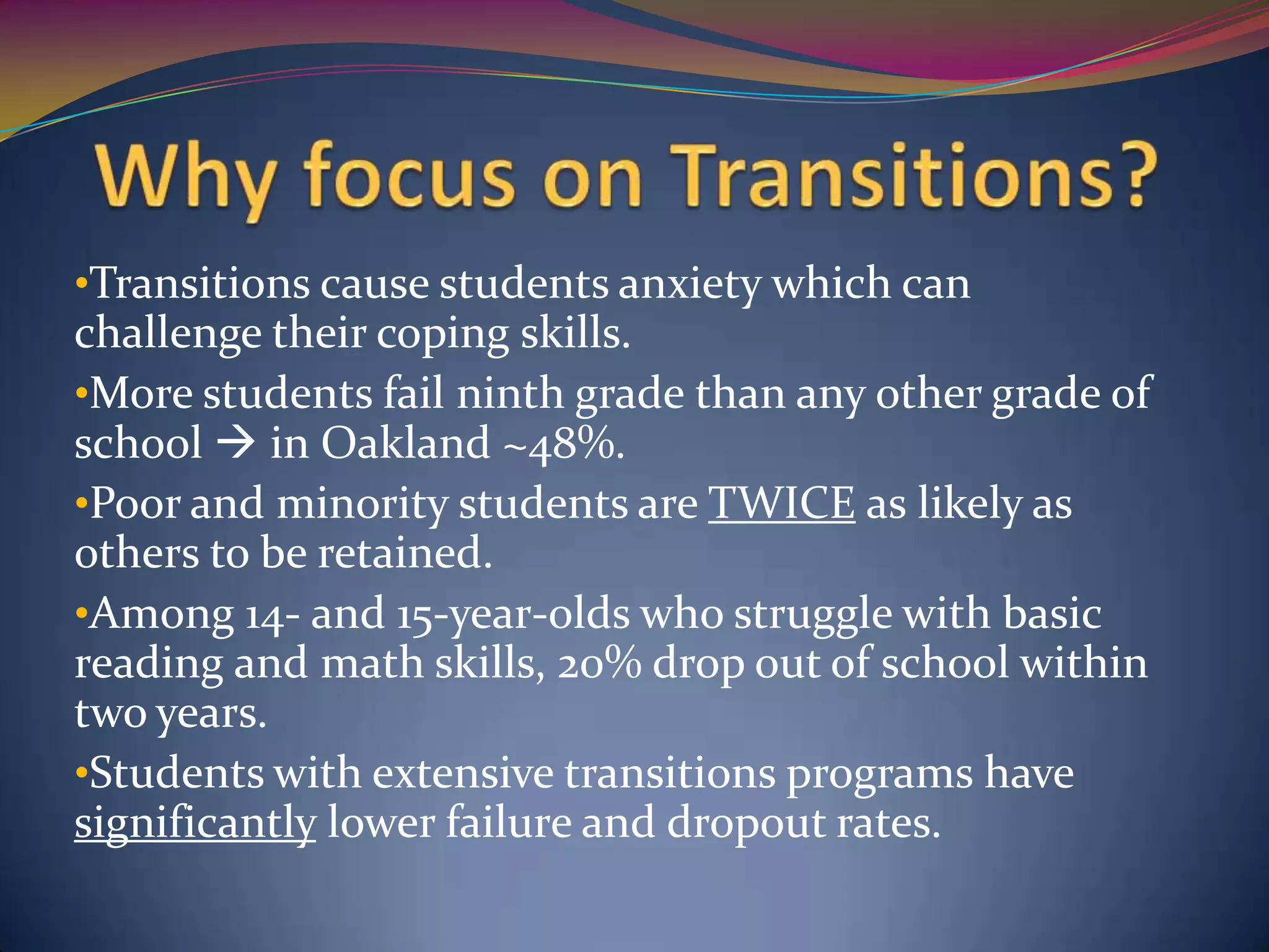 The document discusses how transitions between schools cause anxiety for students and discusses challenges associated with the transition to 9th grade. It notes that poor and minority students are twice as likely to be retained in 9th grade. Effective transition programs can help lower failure and dropout rates by addressing the academic, social, and procedural concerns students face when switching schools. Such programs build community, respond to student needs, and facilitate the transition process in a comprehensive way.