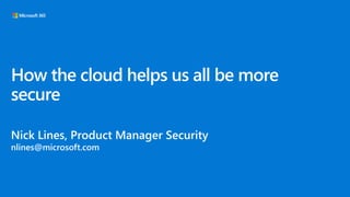 This document discusses how Microsoft's cloud security services help organizations be more secure. It provides an overview of Microsoft's security tools across threat protection, information protection, identity and access management, and security management. These include services like Azure Active Directory, Azure Security Center, Microsoft Threat Protection, and more. The document also emphasizes that Microsoft partners with other security vendors and organizations to provide a more comprehensive ecosystem of intelligent security solutions.