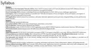 The document outlines a comprehensive syllabus on Next Generation Networks (NGN), covering their introduction, convergence, architecture, protocols, and management. It highlights the evolution towards NGN, motivations for its adoption, and the various applications and challenges associated with it. Additionally, it discusses the benefits of network convergence, types of convergence networks, and their implications in reducing costs and enhancing performance while addressing the challenges such as interdependency and resource allocation.