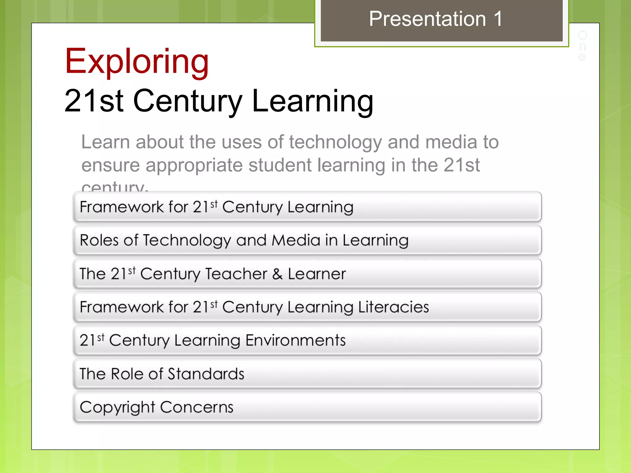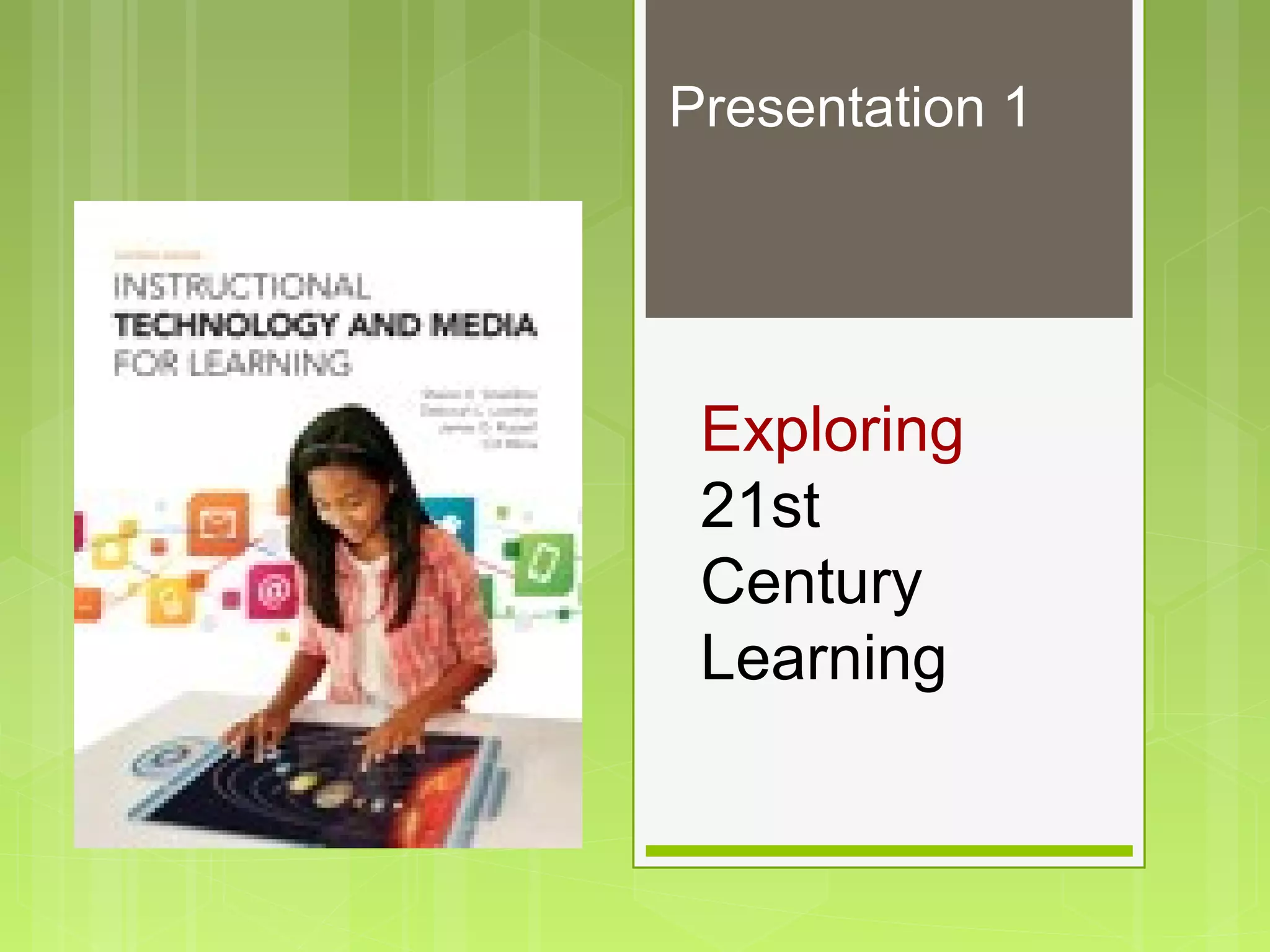 This presentation discusses 21st century learning and the role of technology and media in education. It addresses frameworks for 21st century skills like global awareness, entrepreneurship, and lifelong learning. Technology can enhance learning when integrated effectively by teachers and used interactively by students. The role of media centers is expanding beyond traditional libraries to provide online resources and support digital learning. Copyright law protects original works, and educators must understand fair use exceptions and seek permission when using copyrighted materials.