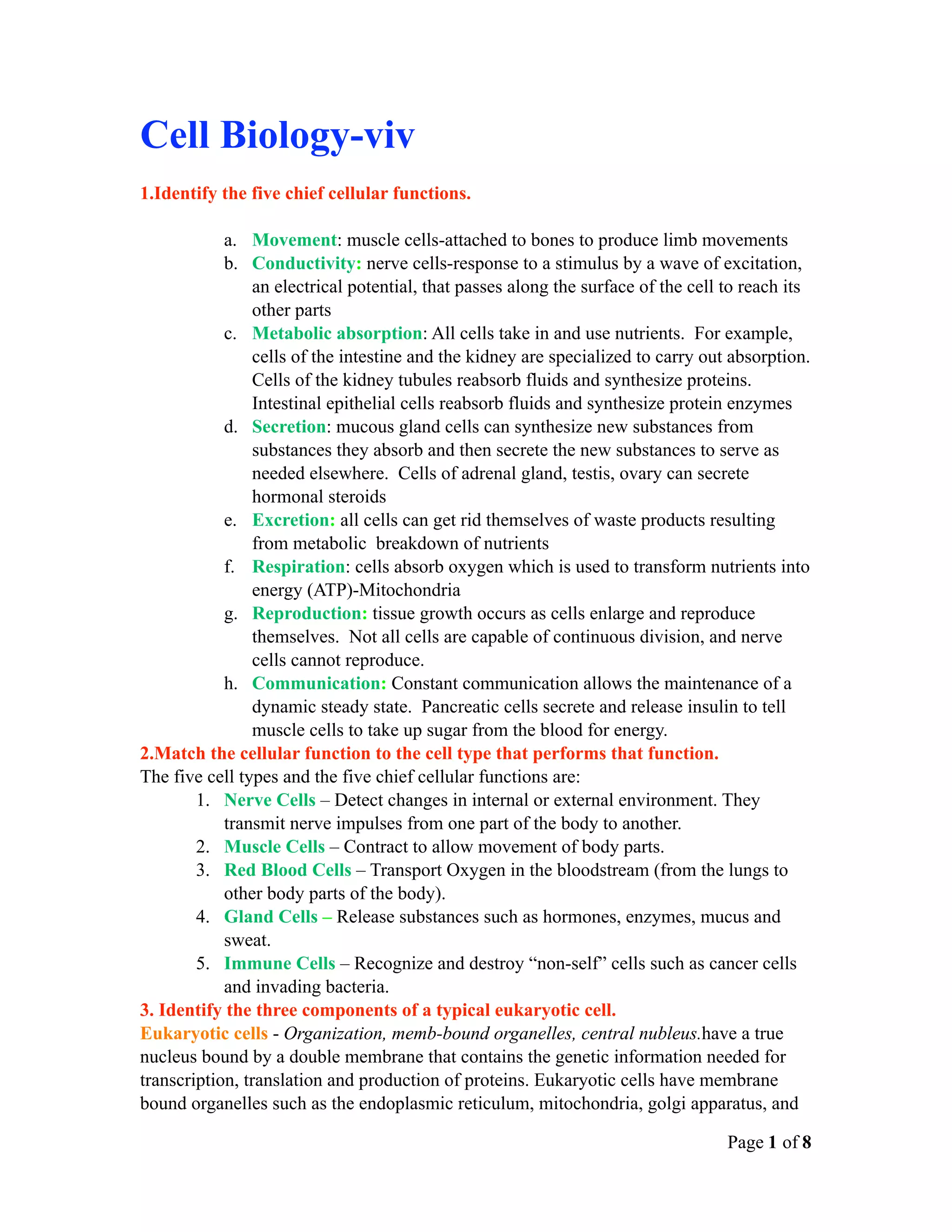 The document summarizes cellular structures and functions. It identifies the five chief cellular functions as movement, conductivity, metabolic absorption, secretion, and excretion. It then describes the structures and functions of key cellular organelles like the nucleus, ribosomes, endoplasmic reticulum, Golgi apparatus, lysosomes, and mitochondria. It also discusses plasma membrane structure and functions such as transport, protection, and cell communication.