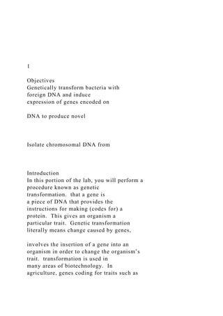 The document discusses the process of genetically transforming bacteria using a specific plasmid (pglo) that allows for the expression of a gene coding for the green fluorescent protein (GFP) from a jellyfish. It outlines the steps involved in the transformation process, including preparation, heat shock, and selection using antibiotic resistance, as well as the significance of gene regulation in expressing newly acquired traits. Additionally, it emphasizes the applications of genetic transformation in various fields like agriculture, medicine, and biotechnology.