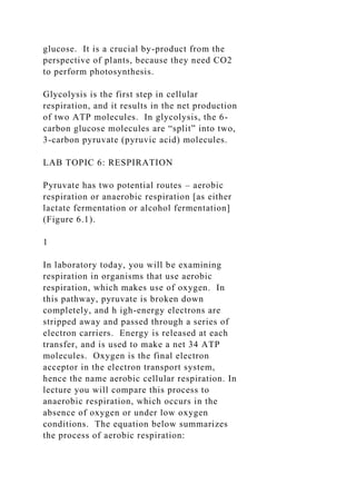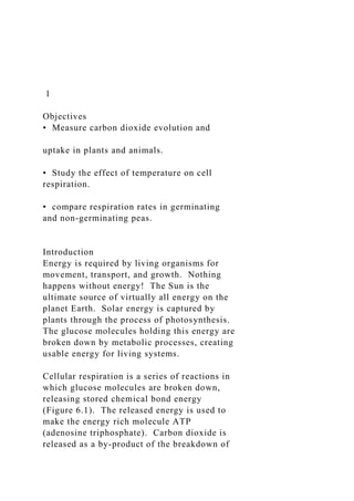 The document outlines laboratory experiments focusing on cellular respiration in plants and animals, specifically measuring carbon dioxide evolution, respiration rates of germinating vs. non-germinating peas, and the effect of temperature. It provides procedures for conducting these experiments with a detailed focus on using CO2 probes, analyzing data, and understanding the processes of aerobic and anaerobic respiration. Additionally, it addresses the relationship between photosynthesis and respiration, along with methodologies for studying the effects of environmental factors and inhibitors on these biological processes.