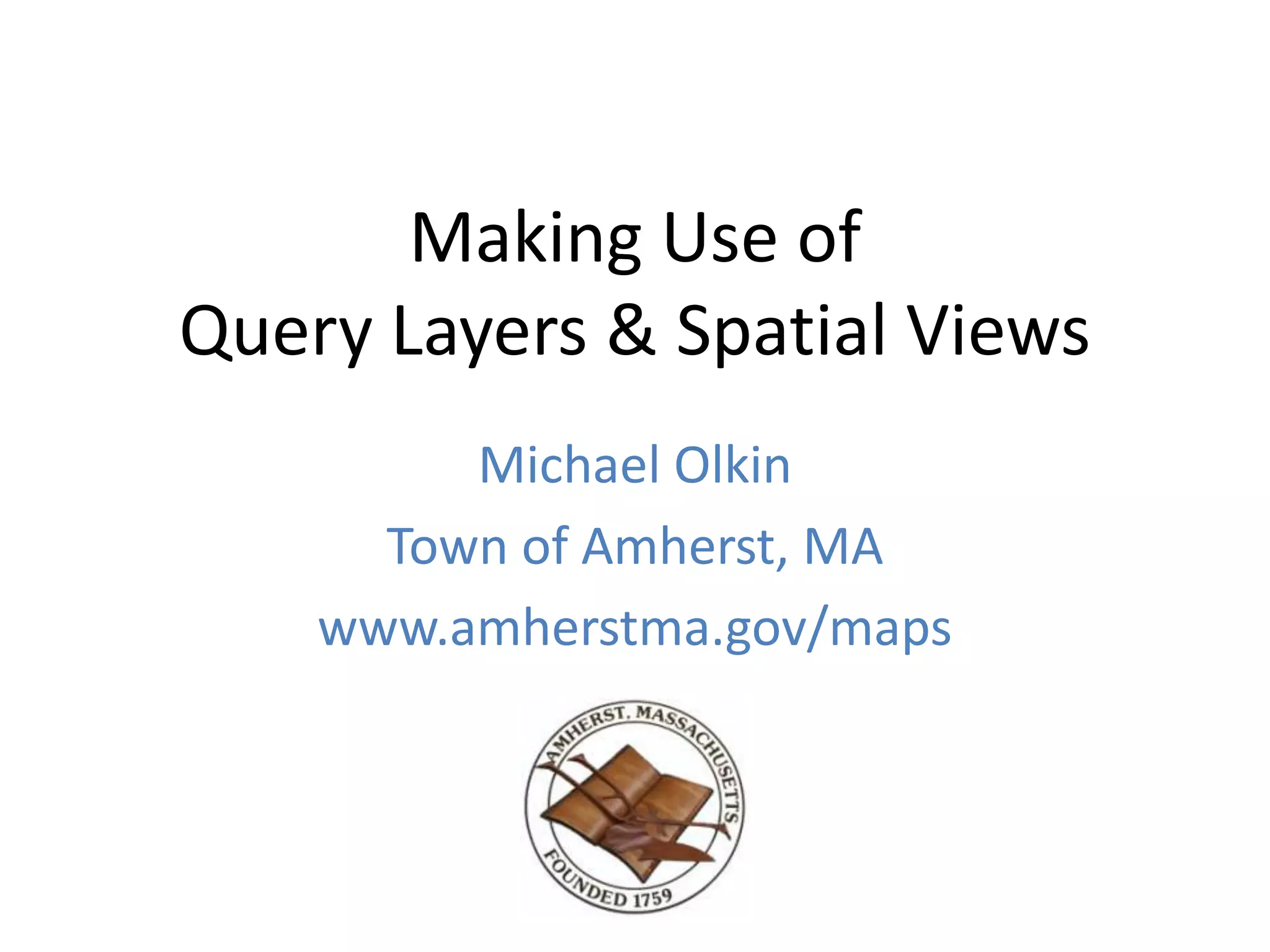 The document provides an overview of query layers and spatial views in ArcGIS, explaining their purpose and how to create them using SQL queries. It highlights practical use cases such as managing unique identifiers for parcels through centroid-based coordinates and the advantages of spatial views over traditional joins. The presentation also mentions technical requirements and offers examples of SQL commands for setting up query layers and spatial views.