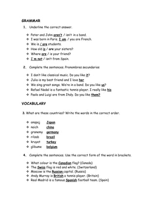 This document contains an English grammar and vocabulary exercise with 8 sections. It tests understanding of parts of speech, verb conjugation, vocabulary related to countries and nationalities, comprehension of a short reading passage, writing a short personal profile, and filling in gaps in conversational exchanges. The reading comprehension section contains 10 true/false statements about the details and facts presented in the short story.