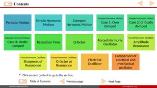 The document covers the fundamentals of oscillations in engineering physics, including types of harmonic motion such as simple harmonic motion and damped harmonic motion. It further explores different cases of damping (over damped, critically damped, and under damped), their equations, and the concept of forced harmonic oscillators and resonance. Key ideas include the effects of damping on amplitude and frequency, as well as the quality factor which measures oscillation sharpness and damping levels.
