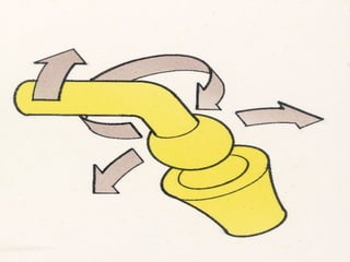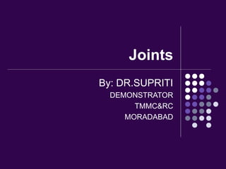 Joints are connections between bones that allow movement. There are 230 joints in the body. Joints are classified structurally based on how the bones connect and functionally based on their range of motion. The main types of joints are fibrous, cartilaginous, and synovial joints. Synovial joints have the most mobility and include ball-and-socket joints of the shoulder and hip. Key parts of synovial joints include the articular cartilage, joint capsule, synovial membrane, and sometimes articular discs.