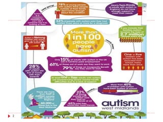 تتناول الوثيقة تشخيص وفهم التوحد عند الأطفال من خلال استعراض الخصائص والسلوكية والتعلم. كما تستعرض الوثيقة الأسباب المحتملة وتأثير العوامل المختلفة على القدرة المعرفية والسلوكية للأطفال المصابين بالتوحد.