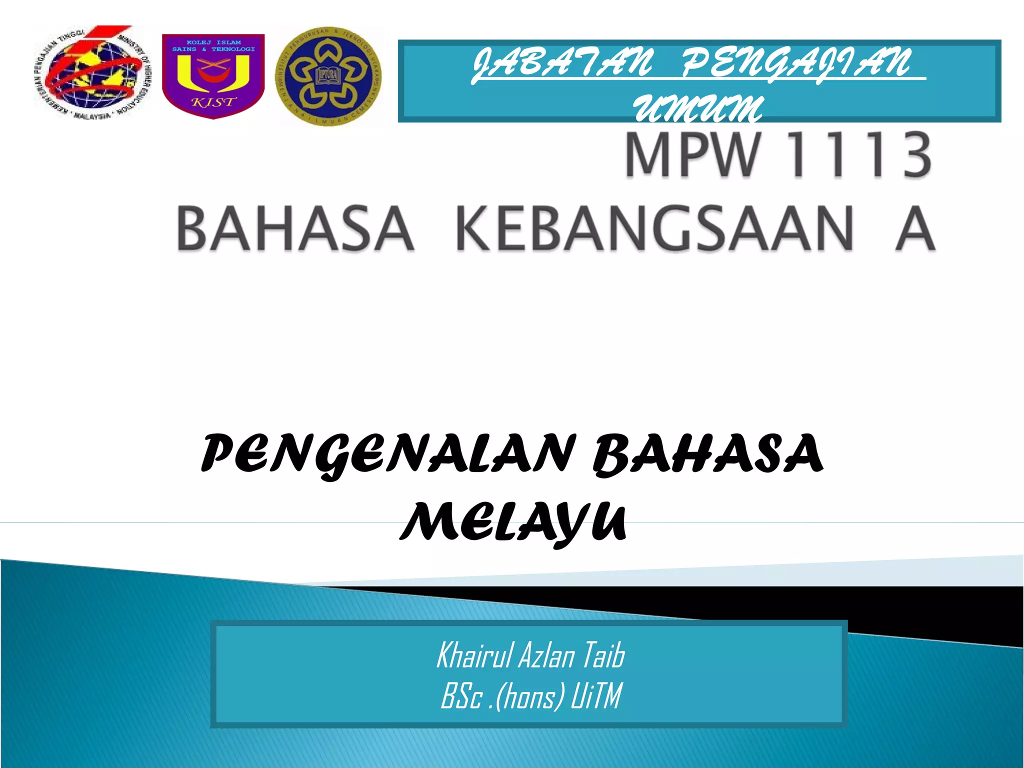 Dokumen ini membincangkan asal-usul dan perkembangan bahasa Melayu, termasuk pengaruh daripada pelbagai tamadun seperti Austronesia dan Hindu. Ia juga menjelaskan peranan bahasa Melayu sebagai bahasa kebangsaan dan rasmi di Malaysia, serta fungsi dan kepentingannya dalam menyatupadukan masyarakat yang pelbagai etnik. Perlembagaan Persekutuan dan akta berkaitan turut menegaskan status dan penggunaan bahasa Melayu dalam sistem pendidikan dan urusan rasmi negara.