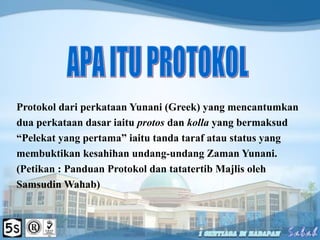 1. Dokumen tersebut menjelaskan pengertian protokol dan asal-usulnya dari bahasa Yunani. 2. Ia juga menjelaskan berbagai konteks penggunaan protokol dalam kehidupan individu, keluarga, masyarakat, dan hubungan antarnegara. 3. Dokumen tersebut menekankan pentingnya pengetahuan dan penerapan protokol untuk menjaga hubungan
