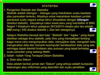 Dokumen ini adalah panduan pembelajaran matematika untuk siswa kelas XI IPS di SMA Negeri 1 Kotabumi, yang difokuskan pada statistika. Terdapat penjelasan mengenai pengertian statistik, jenis data, pengumpulan data, serta teknik penyajian data dalam bentuk tabel dan diagram. Materi ini bertujuan untuk membantu siswa memahami dasar-dasar pengolahan dan analisis data.