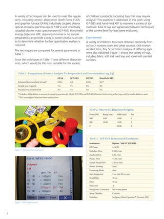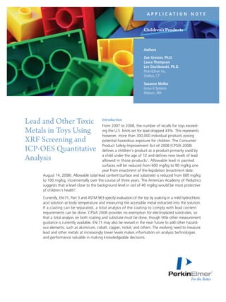The document discusses methods for analyzing toys for hazardous metals like lead. It finds that hand-held XRF is useful for rapid screening of toys to identify those needing further analysis. ICP-OES can accurately measure lead and other metals at levels lower than the current US limit of 600 mg/kg. Using both techniques allows contaminated toys to be efficiently identified for further ICP-OES analysis and quantification. XRF screening prevents wasting time analyzing uncontaminated toys. As limits lower further, this complementary approach of XRF screening followed by ICP-OES analysis will continue to be effective for ensuring toy safety.