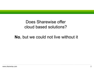 Sharewise uses cloud infrastructure for various purposes like exchanging ideas, prototyping, and scaling their platform. They help customers identify the best investors by delivering investment ideas and recommendations from their international community platform. While they do not directly offer cloud solutions, Sharewise relies heavily on cloud infrastructure to power their distributed team of 12 across Germany and Poland and monitor production.