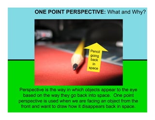This document provides instructions for drawing in one point and two point perspective. It begins with an introduction to perspective and helpful hints. It then walks through 8 steps to draw a cube in one point perspective, including drawing the horizon line, adding a vanishing point, drawing perspective lines, and erasing extras. Additional steps are provided to add a roof, windows, and doors. The document then introduces two point perspective and provides 8 similar steps to draw a cube, including adding two vanishing points and drawing bottom perspective lines. Practice worksheets are included to have students draw boxes in one and two point perspective.