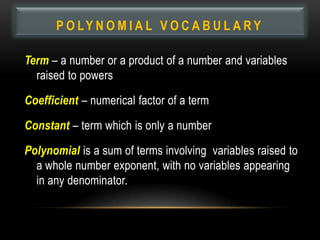 - Types of polynomials include monomials (1 term), binomials (2 terms), and trinomials (3 terms). Degree is the largest exponent of any term.