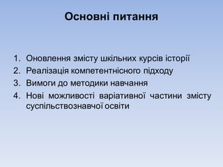 Нові акценти у змісті та методиці шкільної суспільствознавчої освіти 1. 2. Основні питання