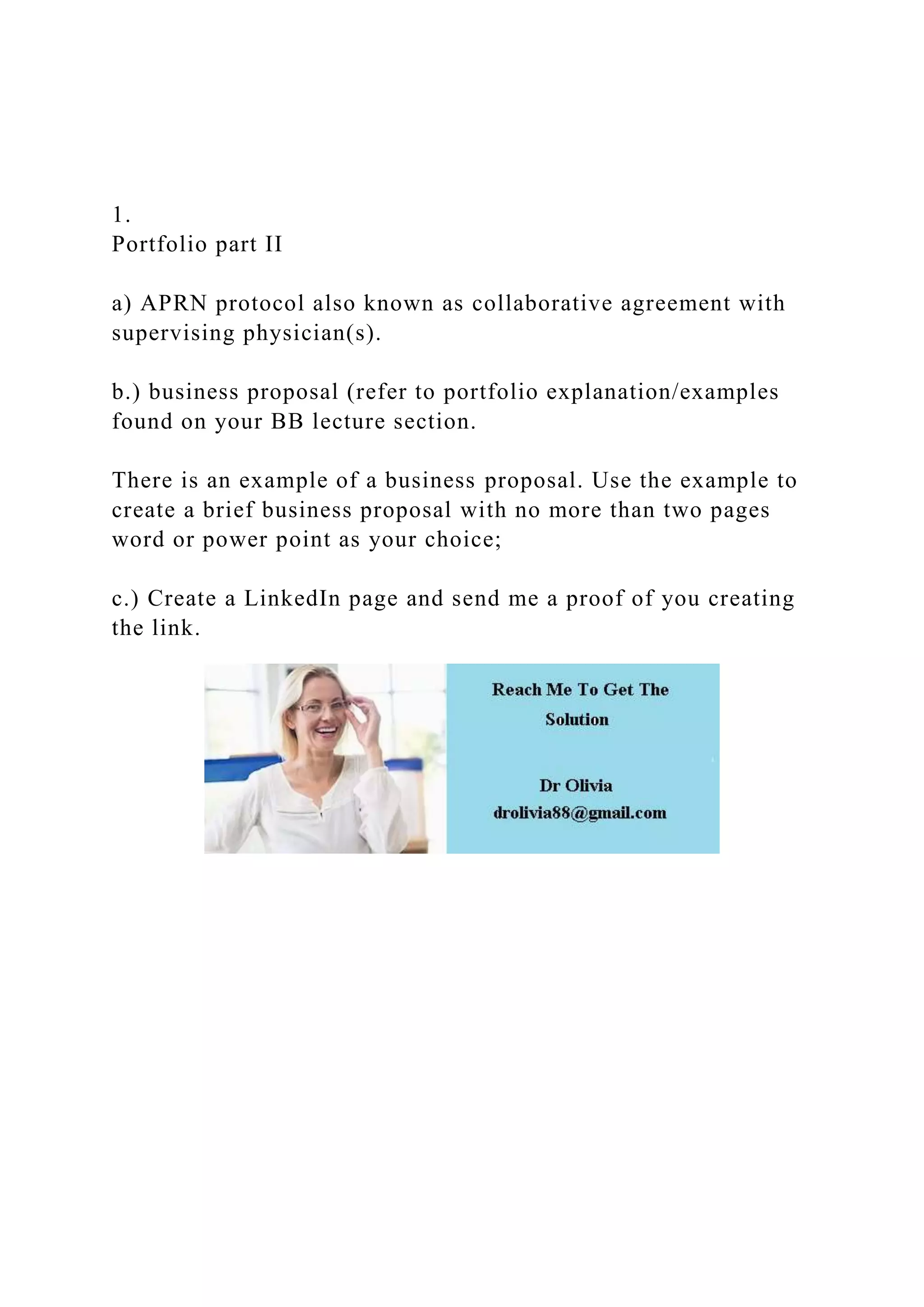 The document outlines requirements for a portfolio, including an APRN protocol or collaborative agreement with supervising physicians, a brief business proposal based on provided examples, and the creation of a LinkedIn page with proof of its establishment. Each section has specific guidelines and should be completed efficiently. The proposal is limited to two pages in Word or PowerPoint format.