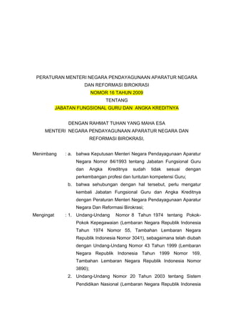 Peraturan ini mengatur tentang Jabatan Fungsional Guru dan Angka Kreditnya. Ditetapkan jabatan fungsional guru termasuk dalam rumpun pendidikan dan jenis guru meliputi guru kelas, mata pelajaran, dan bimbingan. Tugas utama guru adalah mendidik, mengajar, membimbing, dan menilai peserta didik serta kewajiban meningkatkan kompetensi secara berkelanjutan. Instansi pembina jabatan fungsional guru adal