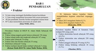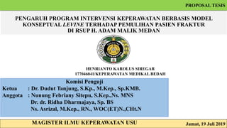 1. Dokumen tersebut membahas pengaruh program intervensi keperawatan berbasis model konseptual Levine terhadap pemulihan pasien fraktur di RSUP H. Adam Malik Medan.