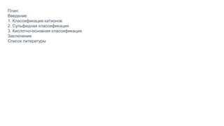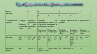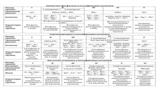 Документ посвящен классификации катионов в аналитической химии, включая различные методы, такие как сульфидная, кислотно-основная и аммиачно-фосфатная классификации. Обсуждаются преимущества и недостатки каждой системы, а также практические методы обнаружения и анализа катионов и анионов. Также упоминаются примеры реакций и их использование в качестве групповых реактивов для разделения и идентификации катионов.