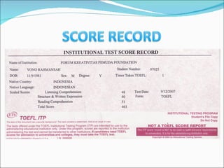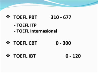 The document provides information about the TOEFL exam, including different scoring systems for the PBT, CBT, and IBT versions. It describes the three sections of the TOEFL IBT exam: Listening Comprehension, Structure and Written Expression, and Reading Comprehension. Listening Comprehension contains short and long conversations followed by multiple choice questions. Structure and Written Expression involves identifying grammatically correct sentences and incorrect words. Reading Comprehension includes questions about passage details, meanings, and vocabulary. Scores are reported separately for each section and an overall score is calculated by adding the section scores, dividing by three, and multiplying by ten.