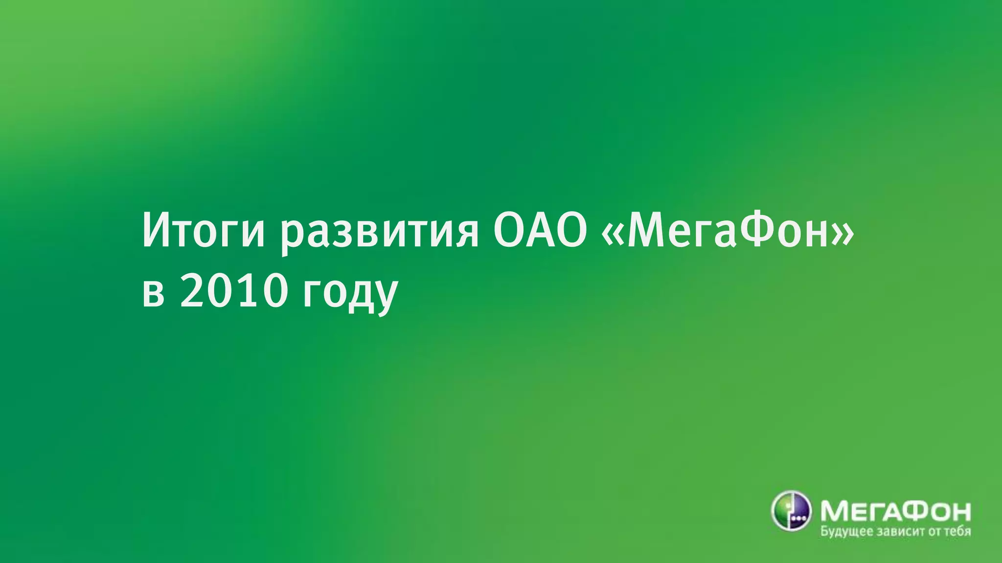 Документ представляет итоги развития ОАО 'Мегафон' в 2010 году, акцентируя внимание на росте мобильного трафика и инновационных технологиях в условиях восстановления экономики после кризиса. Упоминается значительное увеличение количества абонентов и выручки от услуг мобильной передачи данных, а также планируемое расширение сети и новых услуг. Обсуждаются также социальные инициативы компании, включая поддержку спорта и образование молодежи.