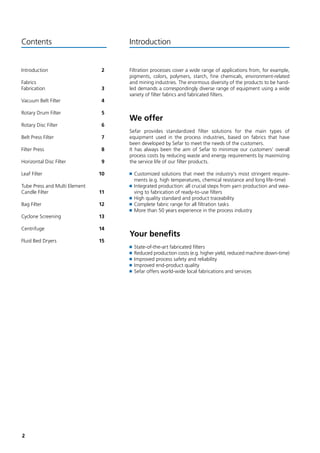 The document discusses filtration processes and provides information about PT. LEITER INDONESIA, a company that offers process filtration solutions using fabrics from Sefar. It summarizes Sefar's offerings for various types of filtration equipment, including vacuum belt filters, rotary drum filters, rotary disc filters, belt press filters, filter presses, horizontal disc filters, leaf filters, tube presses, and multi-element candle filters. The benefits of Sefar's fabrics for these applications include optimized chemical resistance, increased filtration efficiency, low maintenance costs, and long service life.