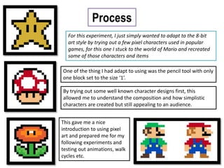 For this experiment, the creator tried recreating popular Mario characters and items to get used to the 8-bit pixel art style using a 1x1 pixel pencil tool. This helped them understand basic character composition and design. In future experiments, they planned to add more detail through shading and highlights.