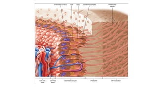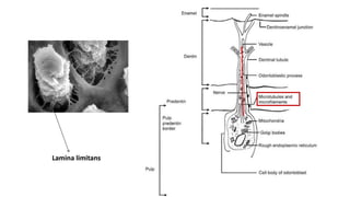 The document provides a detailed overview of dental pulp anatomy, including the composition of pulp cells such as odontoblasts and fibroblasts, their functions, and the structure of the pulp cavity. It distinguishes between various types of canals within the root and discusses the ultrastructure and functions of odontoblasts and defense cells like macrophages and lymphocytes. Additionally, it describes the extracellular matrix components and their roles in the dental pulp environment.