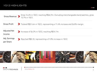 - Gross revenue for the company grew 16.4% in the first quarter of 2012 to R$66.9 million, while excluding interchangeable band watches it grew 13.7%.