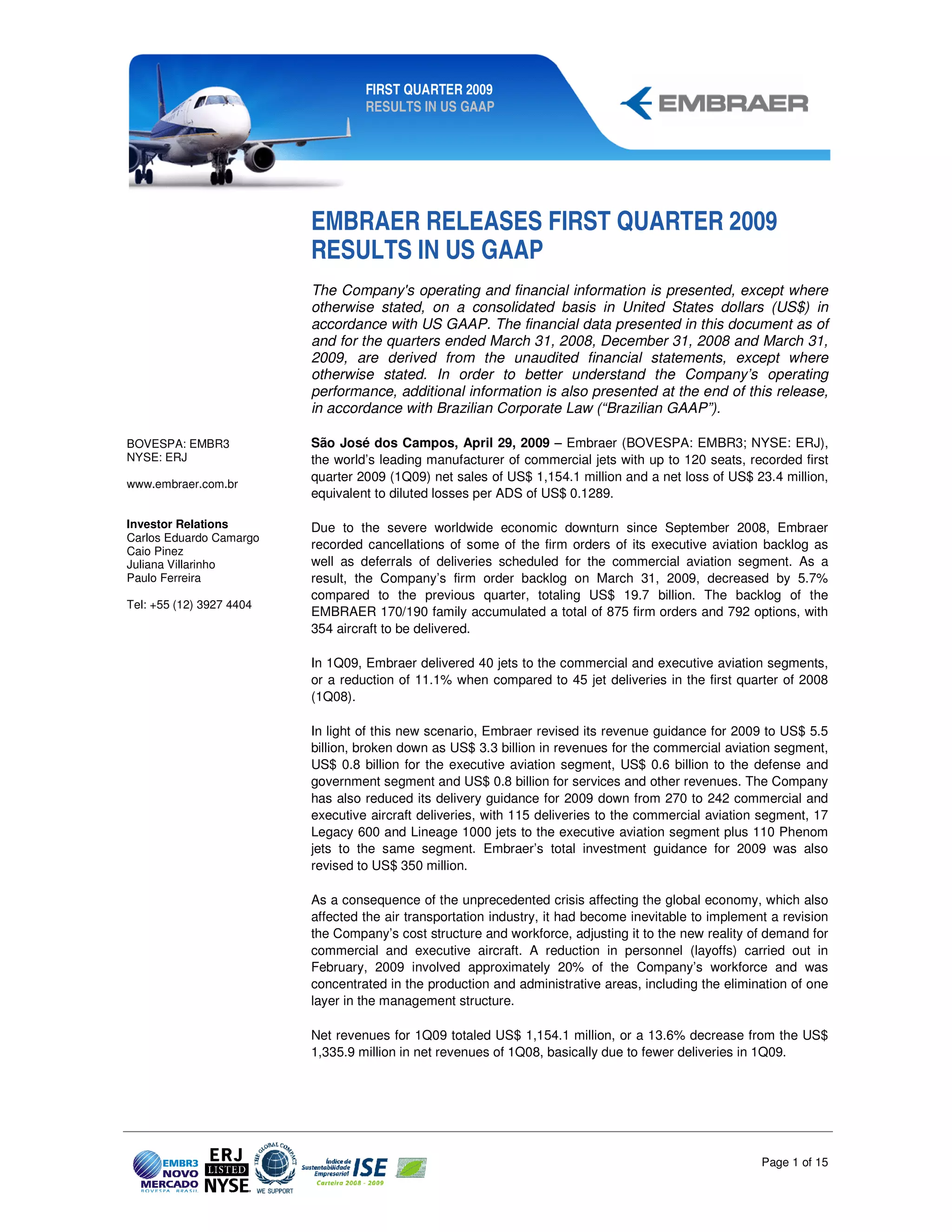 Embraer released its first quarter 2009 results according to US GAAP, reporting a net loss of $23.4 million compared to net income of $85 million in Q1 2008. Net sales decreased 13.6% to $1,154.1 million due to fewer aircraft deliveries. The operating margin fell to 2.4% from 3.6% in Q1 2008 due to lower revenues, costs from layoffs, and penalties from cancelled orders. Embraer revised its full-year guidance downward due to the economic downturn's effects on the aviation industry.