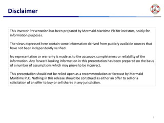 Mermaid Maritime PLC's 1Q2011 results briefing outlines various updates including a new CEO appointment, financial performance, and plans in subsea and drilling sectors. Highlights include improved subsea utilization rates at 51.2%, ongoing contract negotiations, and a significant increase in outstanding bids. The document emphasizes a slow recovery in global demand and indicates a strategic focus on enhancing asset utilization and expanding services.