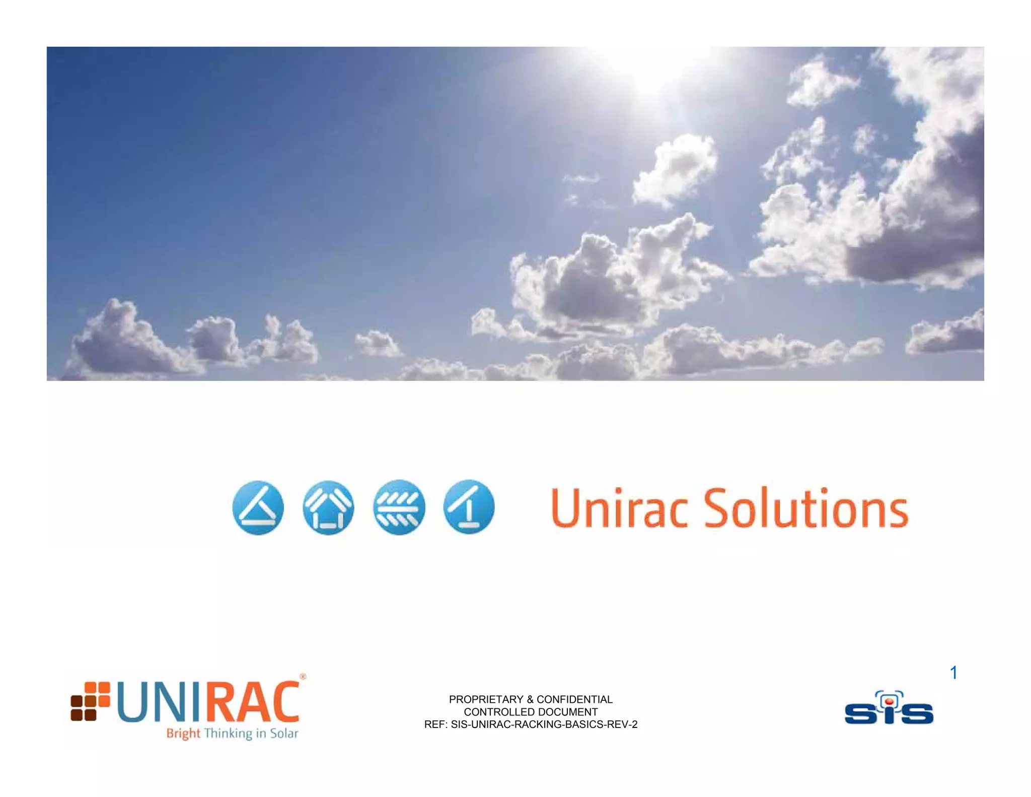 This document provides an introduction to Unirac's PV racking systems. It discusses racking fundamentals and basic terminology. It also reviews various racking options from Unirac, including SolarMount, SunFrame, ULA, RapidRac, S-5!, and ClickSys. Pole mounting options and considerations for racking design prerequisites are also covered.