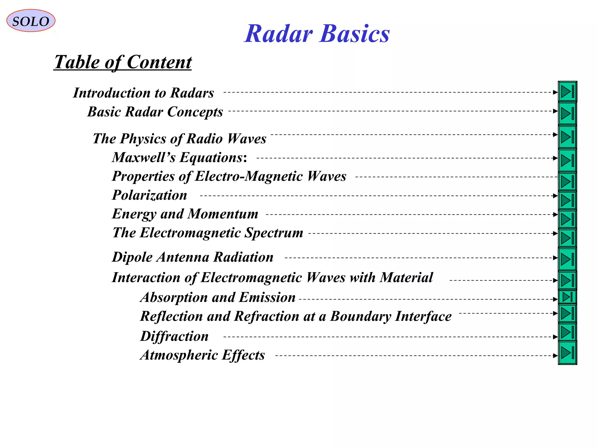 The document provides a comprehensive overview of radar basics, covering topics such as radar concepts, configurations, and principles of operation. It discusses various radar types including continuous wave and pulse radars, along with essential physics related to radio waves and electromagnetic energy. Additionally, it touches on historical radar systems used in World War II and the technical components involved in radar technology.