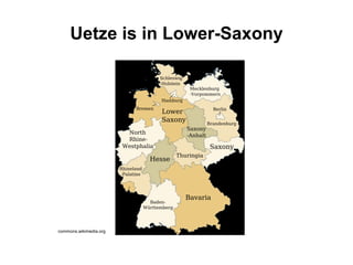 The Realschule in Uetze has about 650 students across its three schools. It is located in a complex with oak trees and playgrounds surrounding the building. Inside are long corridors and classrooms where teachers come to teach their subjects like German, English, math, and sciences. Students come from eight surrounding villages by bus or on foot from Uetze. After lessons end between 1-3pm, there are extracurricular activities. Uetze is known for growing onions celebrated during a festival each September.