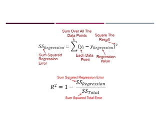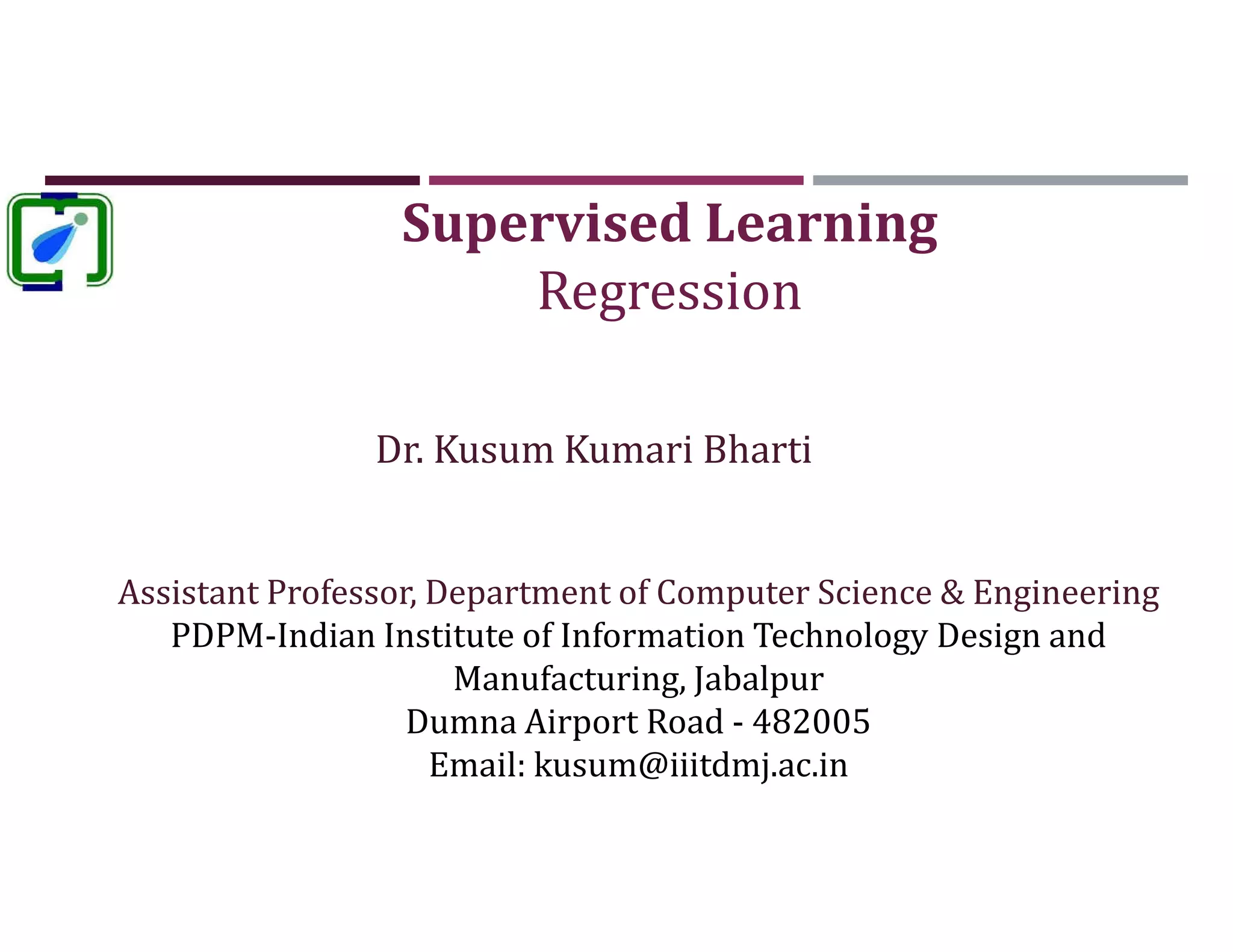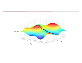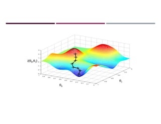 This document discusses supervised learning and regression analysis in machine learning. It defines regression as a technique used to predict continuous target variables by identifying relationships between input features and output variables. Simple linear regression fits a linear function to the data to predict a dependent, or target, variable from an independent variable. Gradient descent is introduced as an optimization algorithm that can be used to fit simple linear regression models by minimizing a cost function.