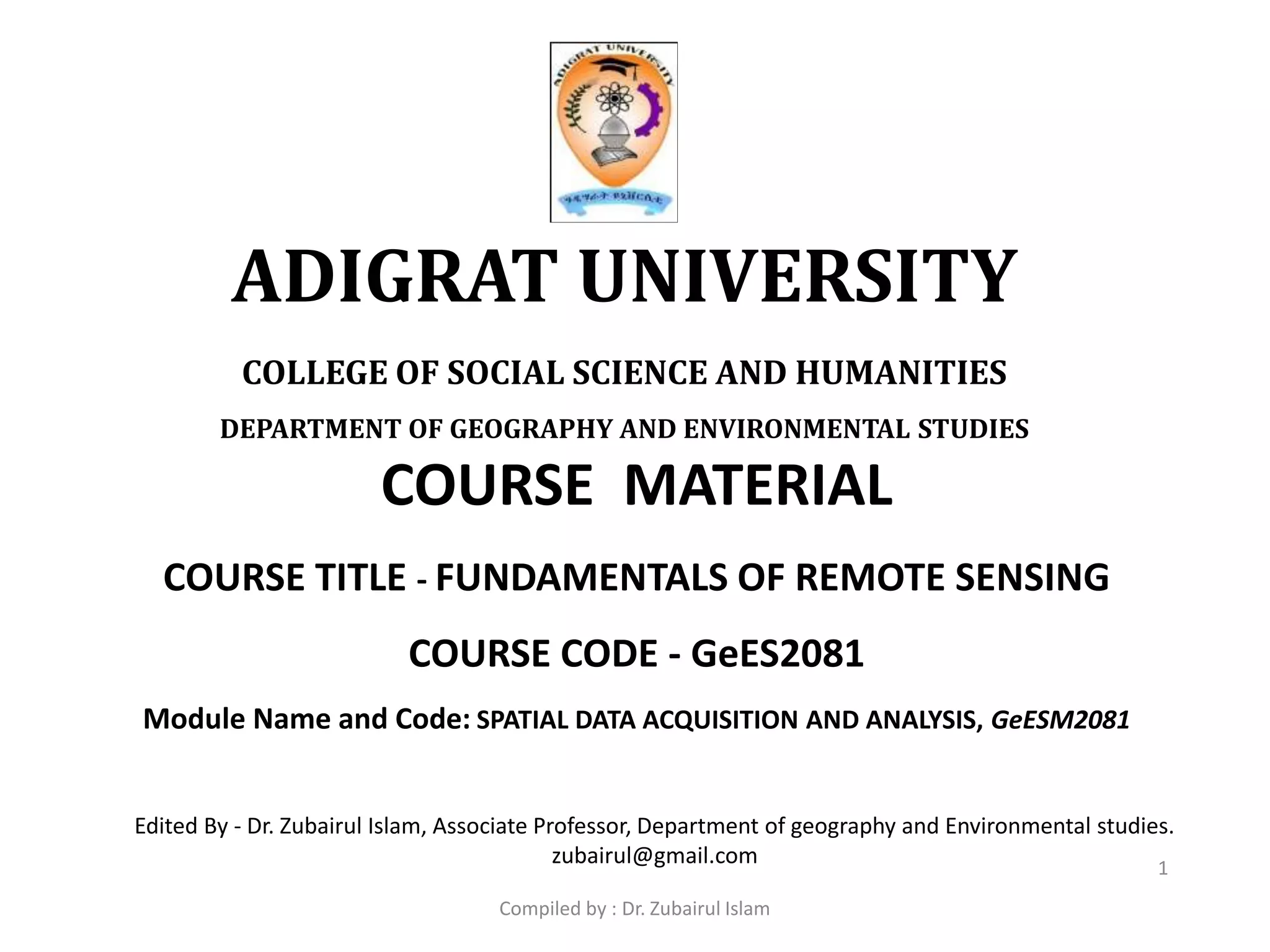 The document provides details about a course on fundamentals of remote sensing, including: