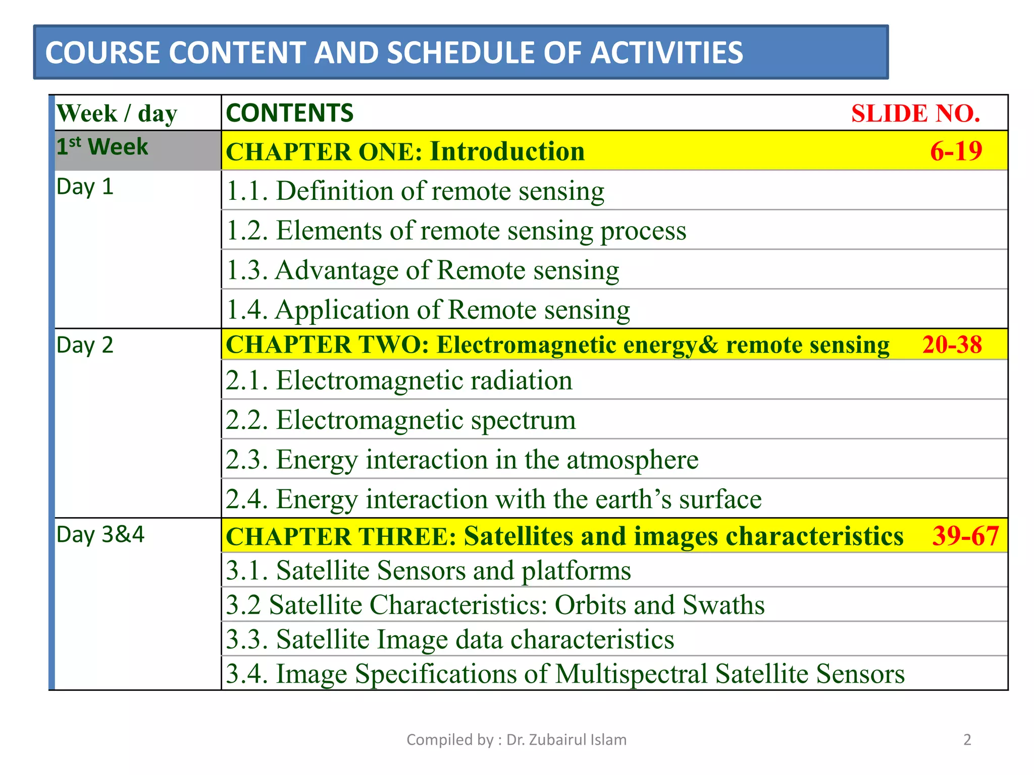 - An outline of the course content and schedule, divided into 3 weeks covering topics like introduction to remote sensing, electromagnetic energy and remote sensing, satellites and image characteristics, and GPS.