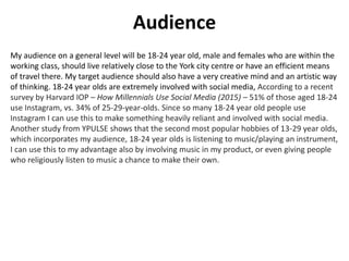 Brandon Lambert is targeting 18-24 year olds in York, England for a new creative project. This age group is heavily involved in social media like Instagram and enjoys listening to music. They also prefer evenings over daytime. Lambert plans to incorporate these interests by making social media and music central parts of the project and holding activities at night. Two existing York attractions - a ghost walk and historic theater - provide examples of entertaining and educating audiences in ways that interest Lambert's target demographic.