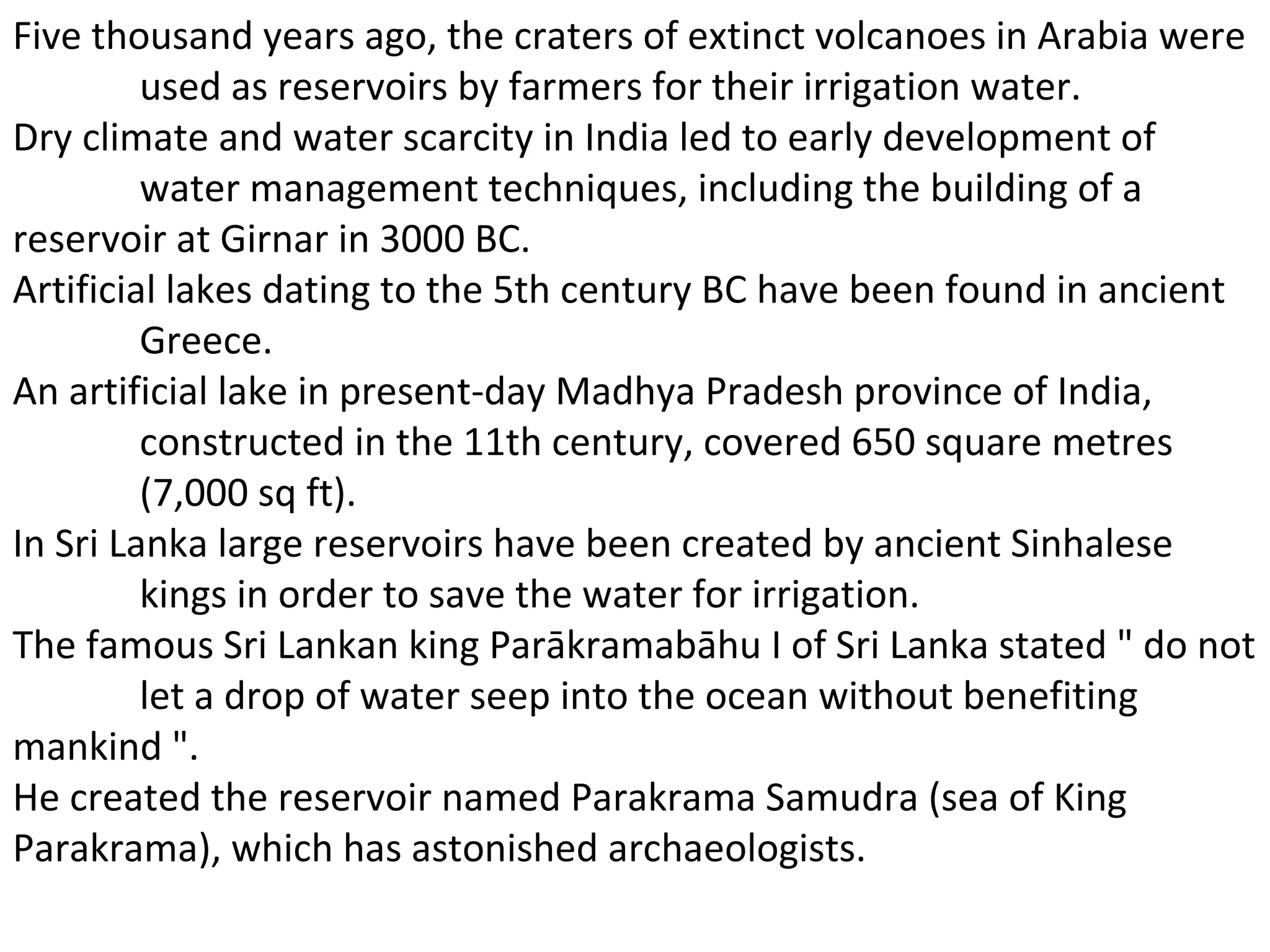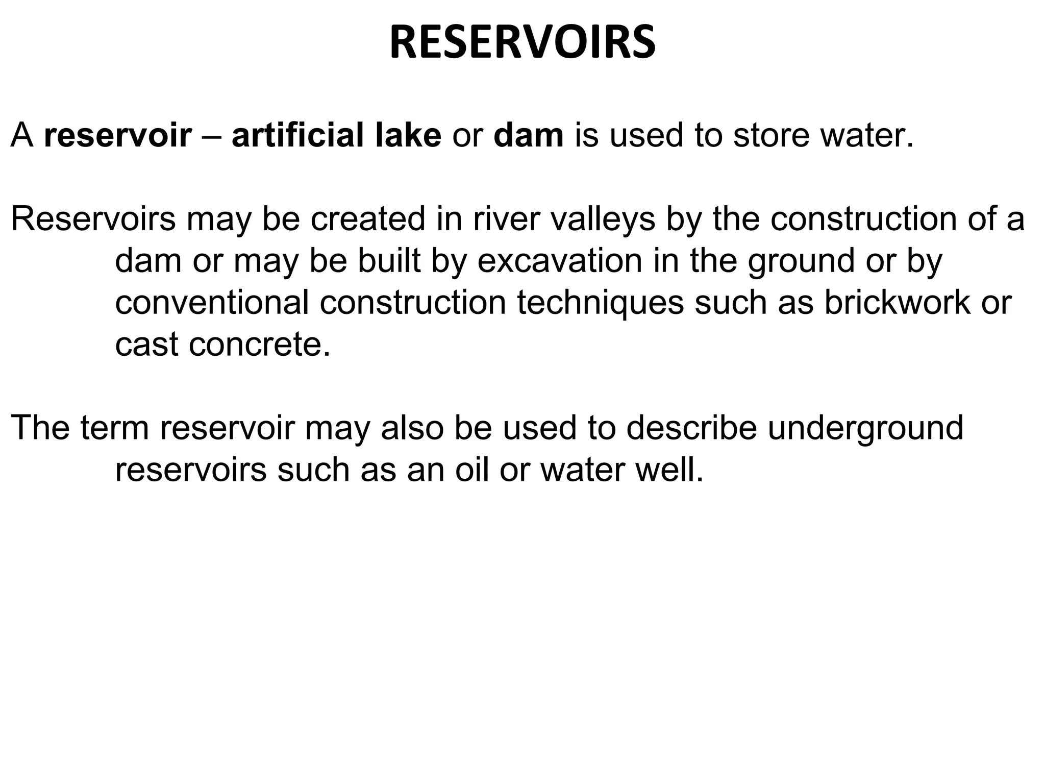 Reservoirs are artificial lakes or dams used to store water. They are created through dam construction in river valleys or excavation. Reservoirs store water for uses like irrigation, drinking water, hydroelectric power, and flood control. The storage capacity and zones of a reservoir, including dead storage, conservation, and flood control zones, determine how much water can be supplied over time periods ranging from daily to yearly. Hydrological investigations study runoff patterns and flood risks to inform reservoir planning and design.