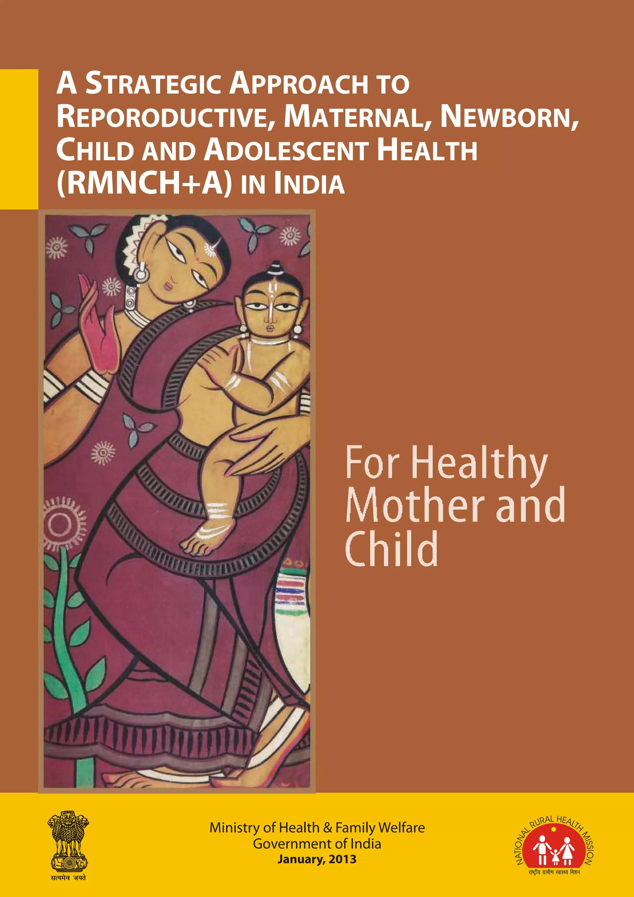 This document outlines India's strategic approach to reproductive, maternal, newborn, child and adolescent health (RMNCH+A). It recognizes that these areas are interlinked and cannot be addressed in isolation. The approach aims to provide integrated services across the lifecycle from adolescence through pregnancy and childbirth. It emphasizes establishing continuity of care between community and health facilities to improve outcomes and achieve national health goals and Millennium Development Goals 4 and 5 on maternal and child health.